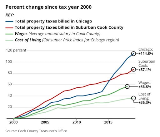 Currently, areas like Chicago and Cook County are seeing a spike in total property taxes. The increase of over 115% in Chicago is worrisome because wages and the cost of living remain the same.