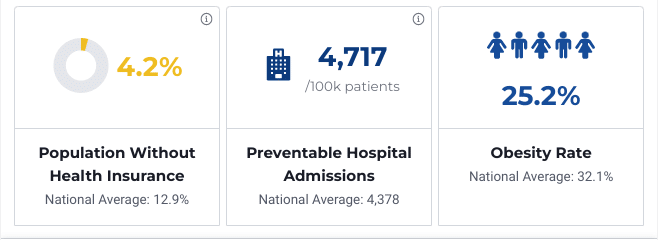 The number of people without insurance is drastically lower than in the rest of the country. Additionally, the obesity rate is much lower than the US average because most of the population lives in or near cities.