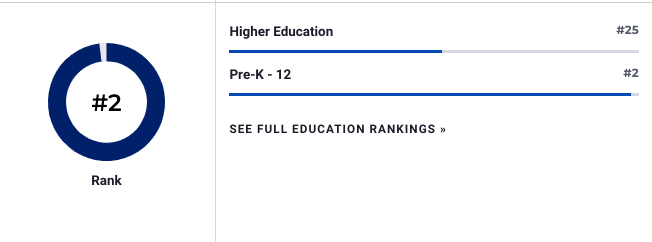 Higher education ranking considers attainment, graduation rates, enrollment, tuition, and debt. Pre-K–12 considers enrollment, standardized test scores, and graduation rates.
