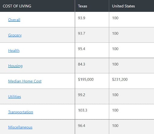 The cost of living in Texas is lower than the national average. On a scale of 100 being the average (the lower the score, the better the cost of living is), Texas has an average score of 93.9.